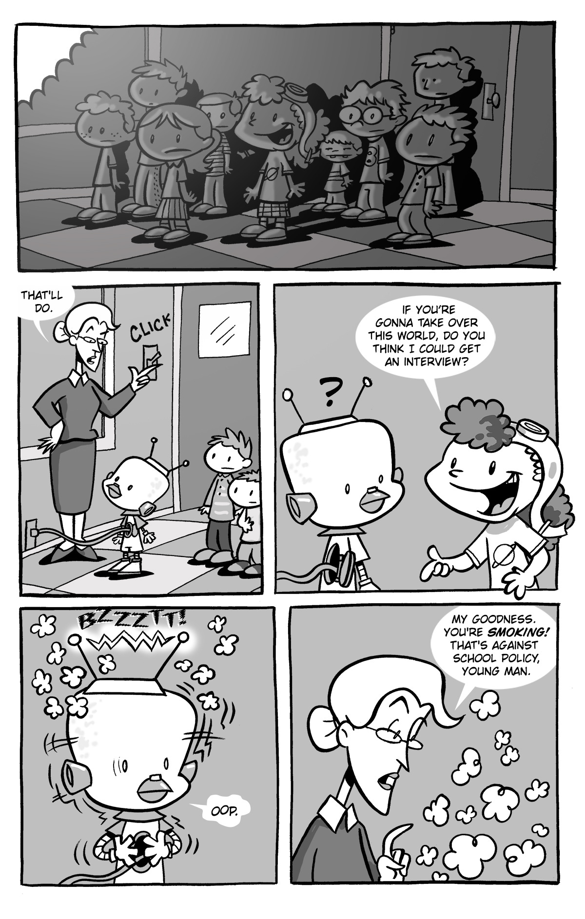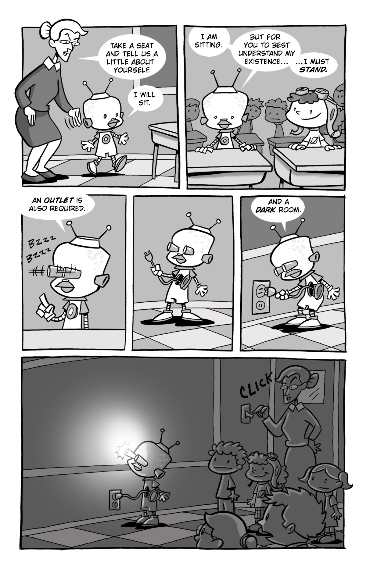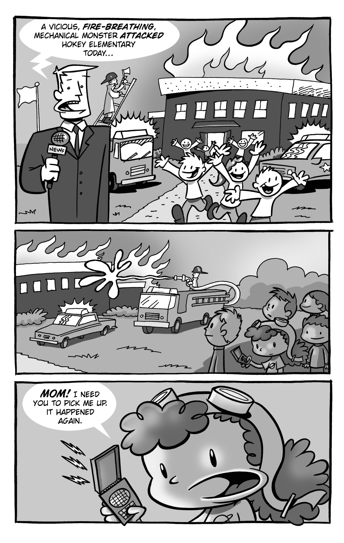 Maybe you know this already, but I’m gonna clue you in just in case: Eleven-year-old Ruth Žukauskas attempted to report a strange (possibly dangerous) situation on planet JEFF to her unreachable mother, Y!TM’s Extreme Shopping lady Carina. Later, Ruth and a room full of 5th graders were introduced to a new classmate — a mechanical boy named TNG. And Ruth reached the unfounded conclusion that TNG is a scout for a Technokyo invasion force set on multi-versal mechanoid domination and the extinction of all organic life.